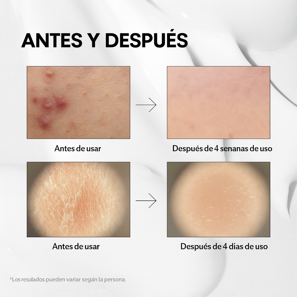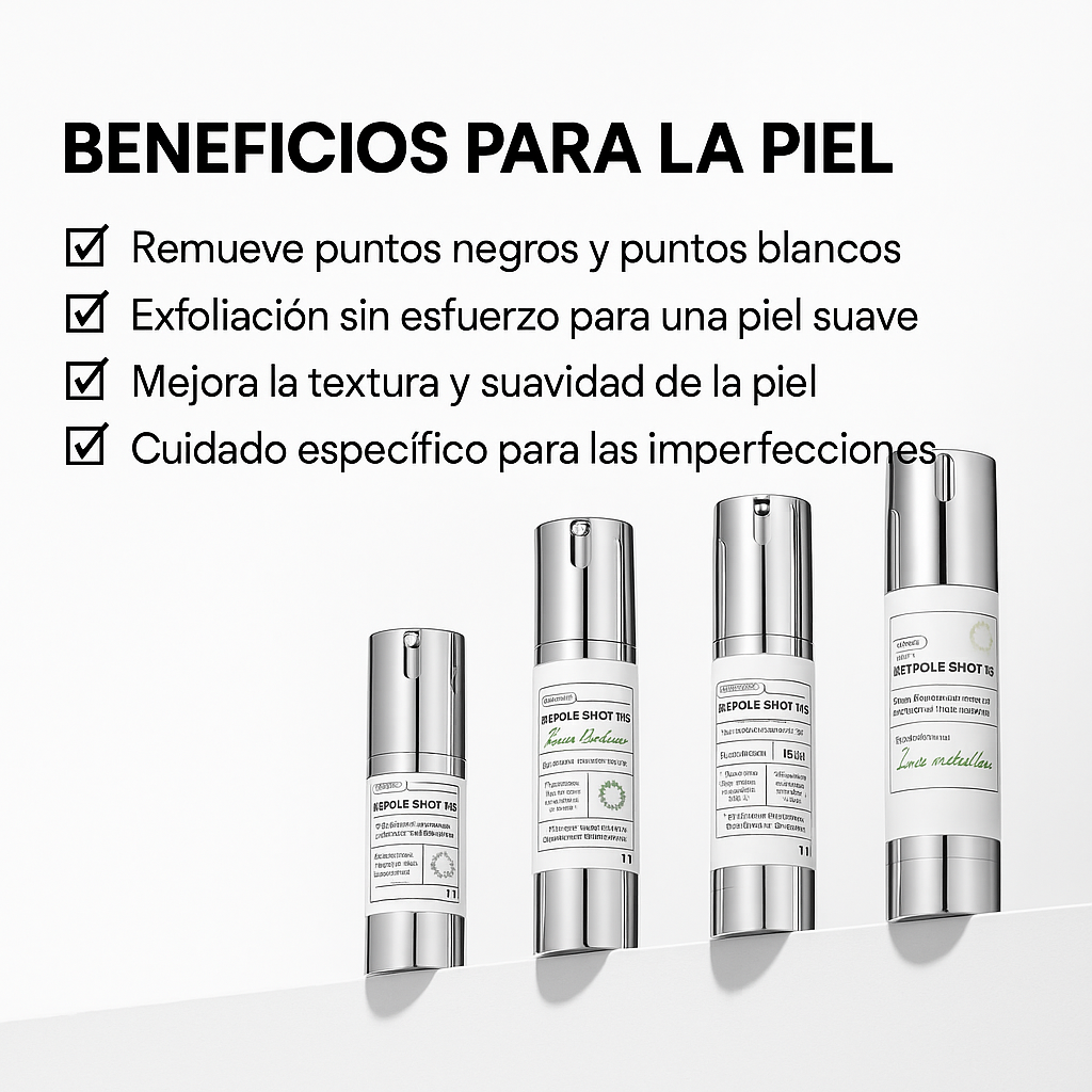 Suaviza y refina la textura de la piel: Ayuda a lograr una tez más uniforme y refinada, disminuyendo las cicatrices del acné, tratando las pústulas y reduciendo la pigmentación y los pliegues nasolabiales.